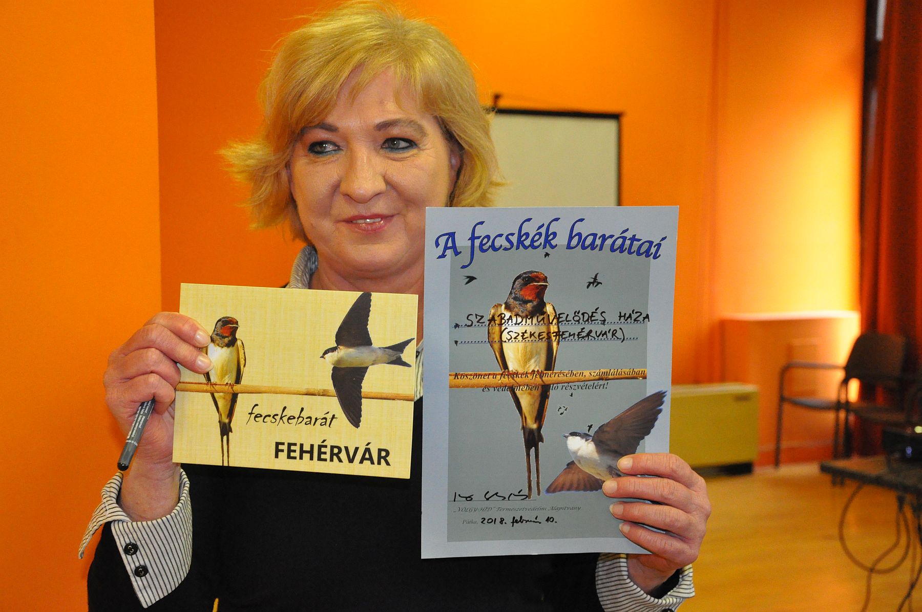 Kiss Dorottya, a Szabadművelődés Háza igazgatója az oklevéllel és a "fecskebarát Fehérvár" táblával